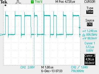 Podemos usar el sketch de Arduino dentro de bitbang_105.zip para generar la señal cuya imagen se puede ver en las capturas de pantalla de osciloscopio que se unen a este paso.
