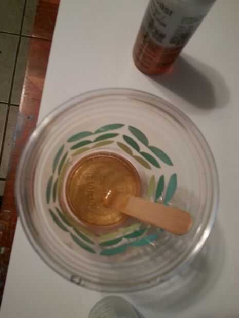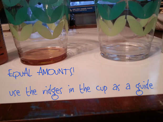 Vierta la resina y el endurecedor. Asegúrese de que raspar hasta la última gota hacia fuera. Es muy importante que estos dos líquidos se han medido igualmente!