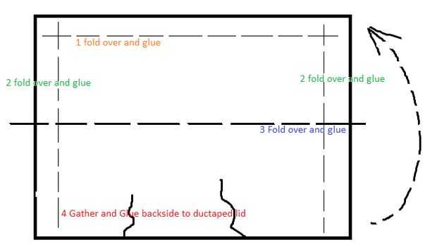 Doblar en 3 bordes y pegamento y doblar toda la pieza por la mitad para hacer un bolsillo y pegamento. (ver dibujo).