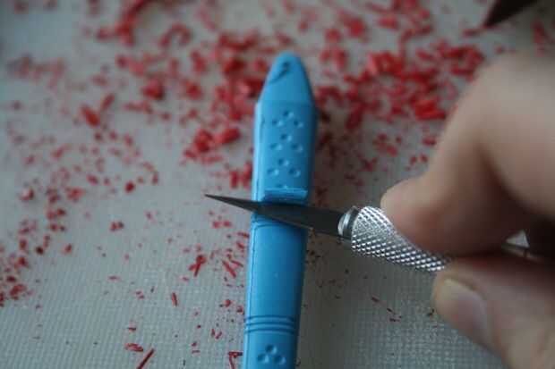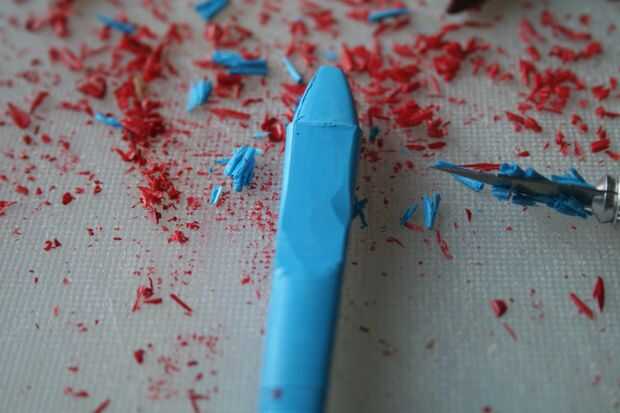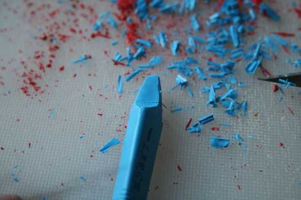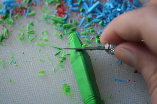 2. Empezar a tallar una superficie plana sobre el crayón como indica cuadros 3 y 4