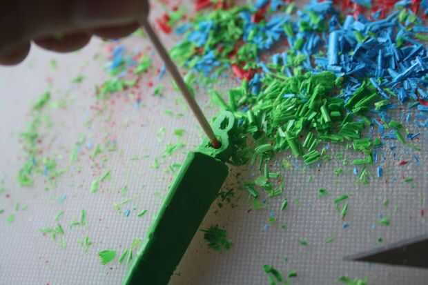 4. Si usted quiere hacer un hueco en su lápiz necesita tener mucho cuidado porque se rompen fácilmente. Haces los agujeros girando su cuchillo o palillo de dientes (cuadro 6). Sujeta una aguja sobre una vela y rápidamente que a través de la tiza también pero tenga mucho cuidado cuando se trabaja con fuego y afiladas herramientas.