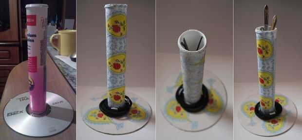 Los elementos principales son un cd viejo y un tubo vacío de vitaminas efervescentes. Otras cosas que usted necesita son: