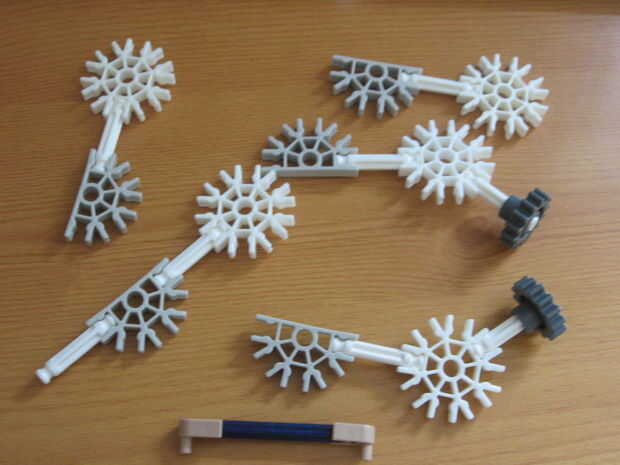 Conectar dos de las cosas de color de la piel en una varilla azul como se muestra. Conecte las dos varillas de whight a la corona gris pequeño. Luego, conecte una barra blanca un whight y conector gris / amarillo. Si no me basta con ver la foto.
