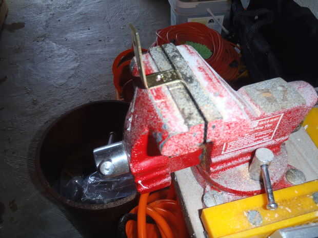 Luego tendrá que doblar la L en forma de soportes para sostener el cargador pod para el tablero superior. Pongo el soporte de la base. Hecho una línea donde estaba la parte superior. Luego ponga el soporte en la mordaza de mesa y doblar el soporte de abajo con mi mano. Os pongo una curva agradable acaba en el soporte con un martillo. Ver fotos.