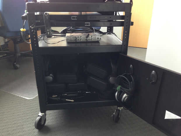 A continuación, coloqué la mesa de mezclas encima de la mesa del carro AV.