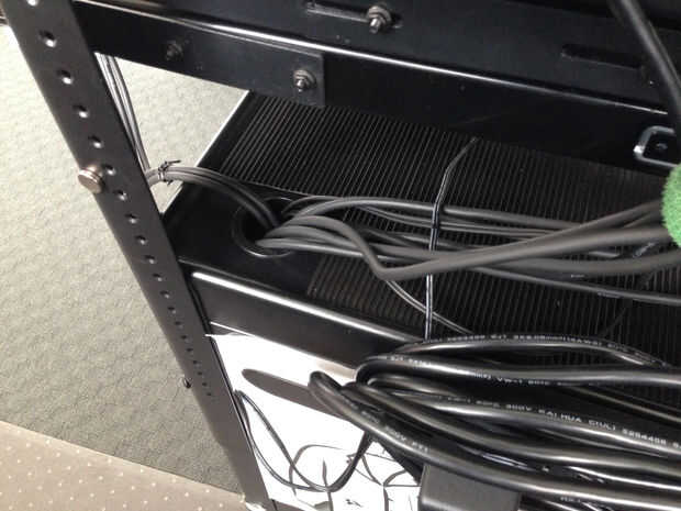 Empujar el cable sobrante en el agujero del grommetted en la parte superior del gabinete y les agrupadas cuidadosamente con bridas. Me aseguré de dejar suficiente holgura en los cables a los estantes deslizable más externos para permitir que los estantes para extender completamente.