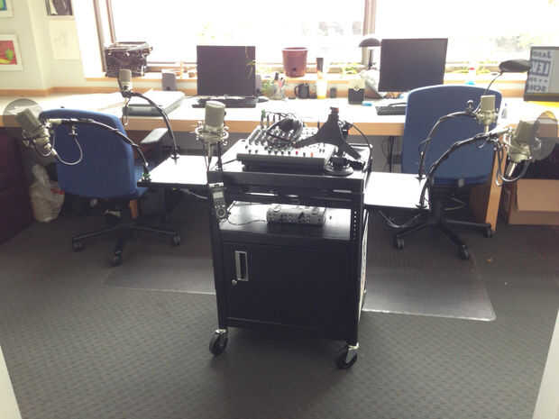 He instalado los micrófonos y las pantallas pop en el otro extremo de cada cuello de cisne.