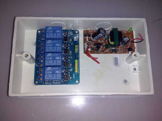 Coloque la placa de relé y la fuente de alimentación como por la foto. La marca donde los agujeros son y utilizan a los tornillos autoroscantes para mantenerlos en su lugar.