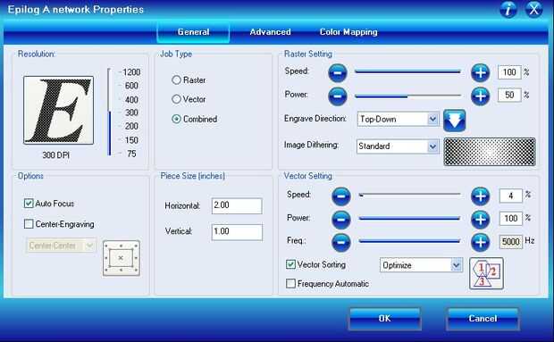 1. adjunto es un archivo LaserTest.dat con todos los parámetros necesarios para una hélice de Epilog de 50W. Ahorre en su sistema. En mi computadora, los valores se encuentran por defecto en... \My Documents\epilog\engraving_setting, pero puedes buscar en cualquier directorio que quieres cargar (o guardar) archivos de configuración. (Usted también puede crear el archivo de configuración desde cero, haciendo coincidir los ajustes mostrados en las fotos.)