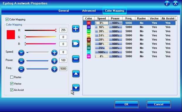 6. Si necesita cambiar cualquier velocidad, en la pestaña "Color Mapping" verás la lista de colores y configuraciones. Haga clic en el color que desee cambiar. La sección de parámetros de la izquierda le permitirá realizar cambios (p. ej., velocidad). Una vez terminado con los cambios, haga clic en el >>> icono para actualizar la configuración. Tenga en cuenta que el último color, fucsia, se utiliza para cortar la tira de prueba (es el último color a cortar) y se establece en 4, una velocidad mucho más lenta que la habitual 8 o así para acrílico de corte 1/4". Esto es para asegurarse de que el corte final separa la tira de prueba aun cuando se disminuye la potencia del láser. Si hace cambios, asegúrese de guardar el archivo de configuración (utilice el botón Guardar en la pestaña "Avanzado").