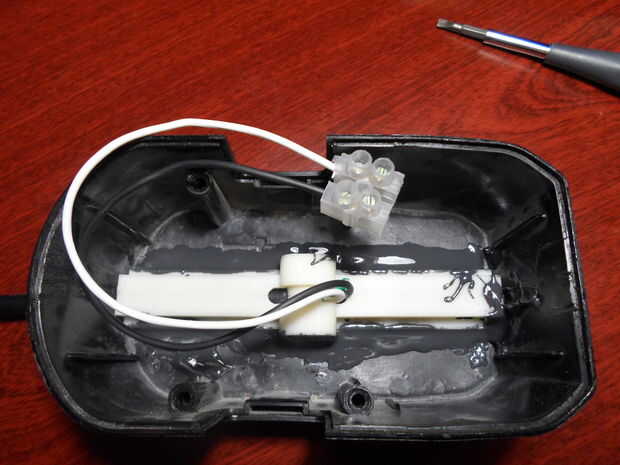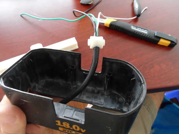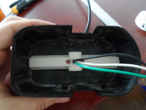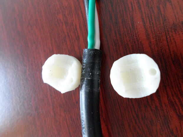 3. Monte el adaptador giratorio en las mitades de la abrazadera, pasar los cables pelados por la pequeña ranura del adaptador giratorio