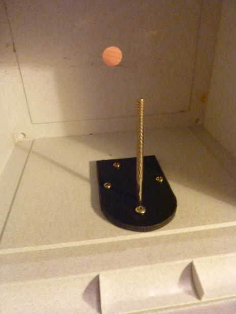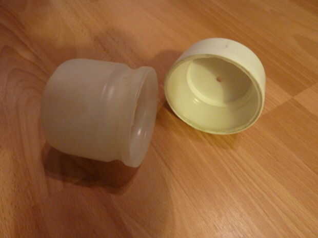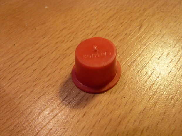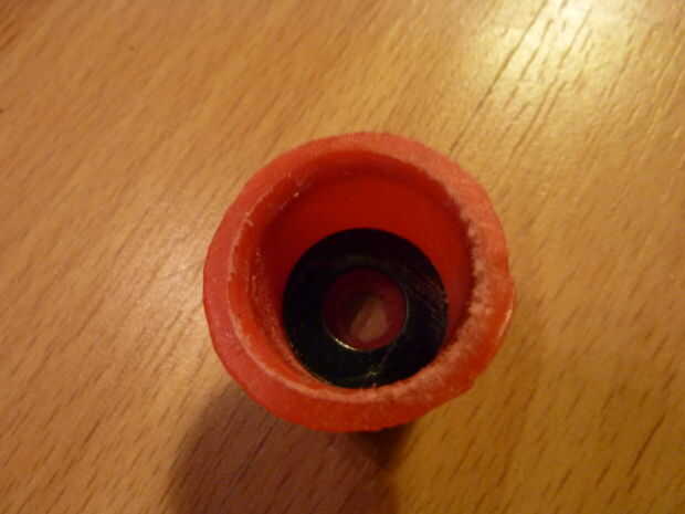 A continuación, cortar la bobina de alambre por la mitad. Una de estas mitades están montada encima de la cubierta de Cool-Aid. En orden para el registro de ajuste, las tuercas que sujetan deban estar por debajo de la superficie de montaje. Esto es donde la tapa de extremo. Estas tapas se utilizan comúnmente para cerrar los extremos de los tubos y orificios de enchufe en chapa. Cada vez que me cruzo con uno, lo Ahorre. Si no tienes ninguno, puede probar con poking alrededor de una tienda de automoción o de hardware. Necesitarás algo que parece un dedal con un borde (o un mini sombrero de tubo de estufa). También debe ser lo suficientemente grande como para aceptar un conector 1/4-20 tuerca y llave de tubo.