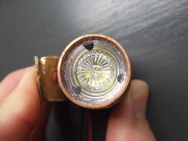 Una vez que el lente y el sellado epoxy curado podemos instalar la electrónica. Enrolle el alambre extra según sea necesario y verifique su ajuste. Con silicona RTV (vulcanizado a temperatura ambiente) sellador o masilla o incluso epoxi llenar los boquetes en el disco de Buck en el compartimiento para que la electrónica es celebrados en el lugar y la cavidad hecha agua apretado.