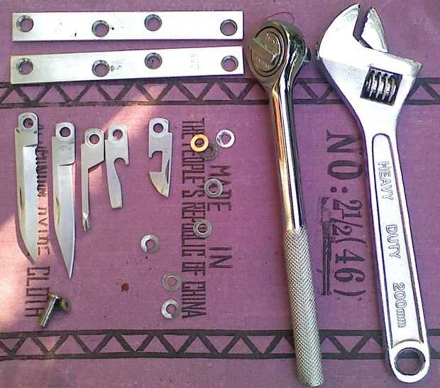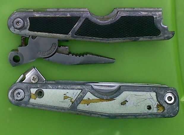 pequeña multiherramienta de cocodrilo elefantevarias funciones en unaPágina antigua cortadora de céspedsería más preciso (el material era más delgado de lo que imaginaba)dos destornilladores, navaja, abrelatas de botella y enlatadosEn el extremo de l