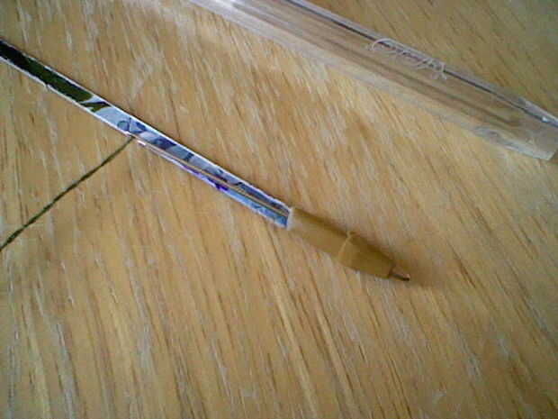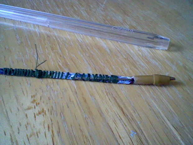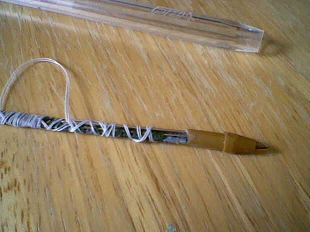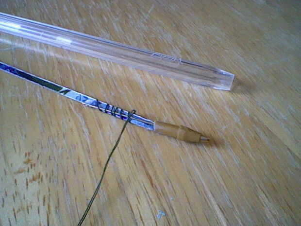 Corte un pedazo de cartón o plástico 4 1/2" a cerca de 4 3/4" largo por hasta 1/8 máximo. Deslice este trozo de cartón dentro de la punta de la pluma. Deslizar una aguja roscada en la punta de la pluma. Mantenga el la aguja y envuelva el hilo alrededor de la aguja y el cartón. Repita hasta tres agujas de coser. Esto podría ser ideal para los viajeros porque es lo suficientemente pequeño como para caber en un bolsillo.