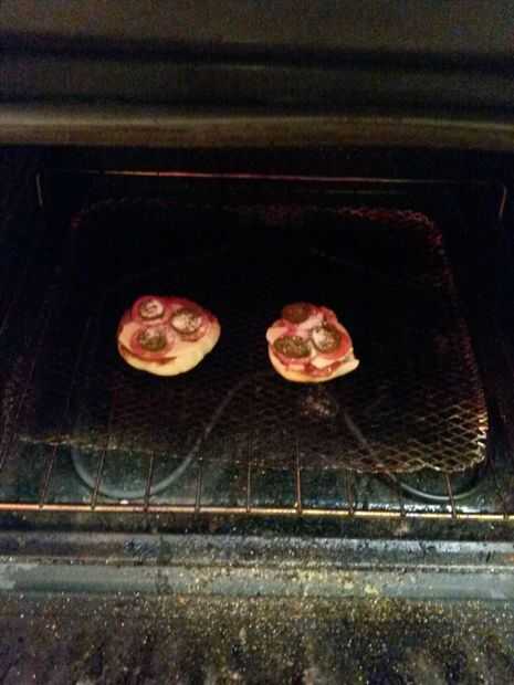 Colocar las mini pizzas en el estante inferior del horno. Cocinar durante 3 minutos o hasta que el queso esté ligeramente. marrón
