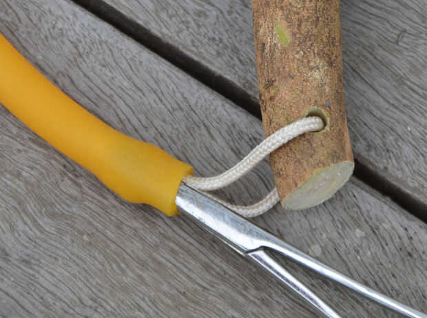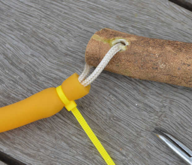 1. Pasar una longitud de 10 cm de la cuerda por el agujero y anudar los extremos juntos en un solo nudo.