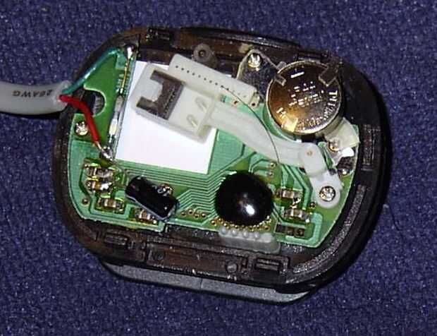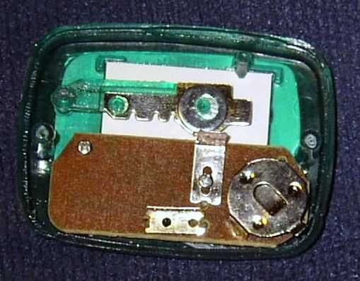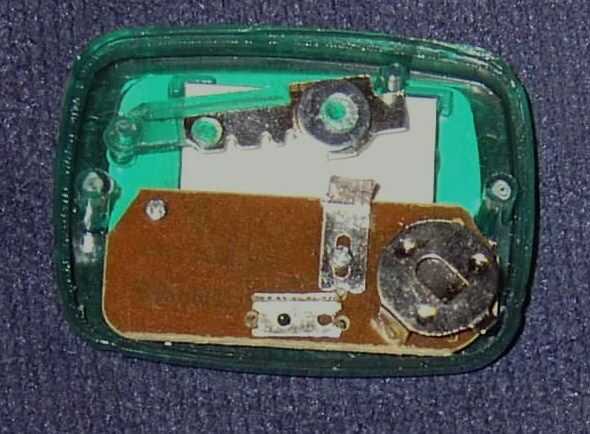 Para el podómetro que utiliza, el diseño es un poco diferente. Vea la foto. El brazo es de plástico y tiene un pequeño imán. Usted debe ser capaz de ver la primavera poco curvada sosteniendo el brazo. A la derecha es un pequeño tubo de cristal con dos conductores en él. Esto se llama un interruptor de láminas. Cuando el imán viene cerca de él, los dos cables dentro están cortocircuitados juntas por lo que los resultados son los mismos que el podómetro verde.