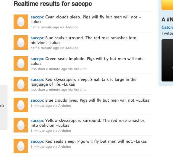 Este es un proyecto que fue inspirado por Twitty juguete de gato Kitty http://makezine.com/22/kittytwitty/ de Marc de Vinck . Incorpora un lector RFID y BlinkM, un LED RGB programable. La lámpara tweets poemas al azar de color cuando detecta una de las tres tarjetas RFID que representan uno de los colores primarios de luz. Estos colores se pueden mezclar lo que le permite hacer siete diversos colores de poemas. Un poema de ejemplo rojo es "rojo sirenas. Relojes de hacen una buena cama.