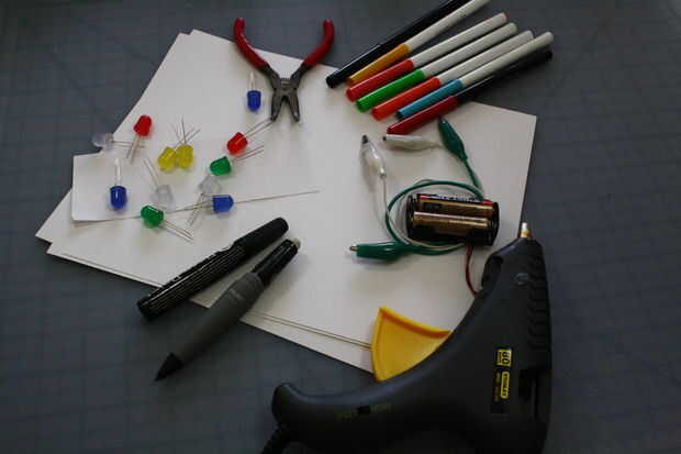 Esta tarjeta fue hecha de YuKonstruct circuito escriba construir noche y utiliza la pluma de la tinta conductora de Electroninks y una etiqueta engomada Chibitronics LED.Para esta tarjeta necesitarás:Cartulina oscura (yo usé mitad de 8.5 x 11 hoja de