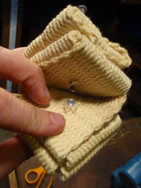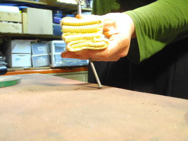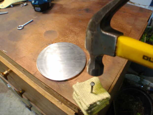 Tomé un clavo grueso y martillado por el cubo de fieltro para hacer un camino para que el perno que pasar por todo esto.