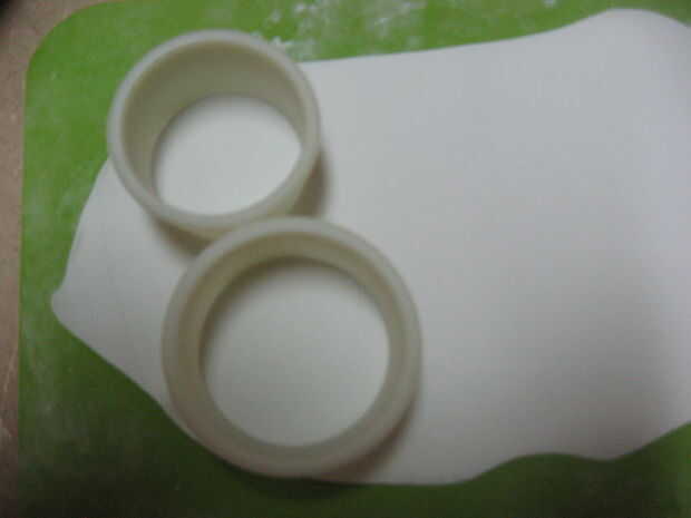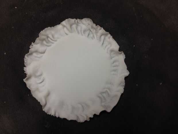 - (Opcional) Para agregar una calidad etérea tomar el lugar del círculo cortado en la espuma almohadilla de flores y arrastrar ligeramente el extremo más pequeño de mi herramienta balling alrededor del borde para añadir adornos, que al final darán al fantasma de una apariencia de flotar por encima de tu pastel