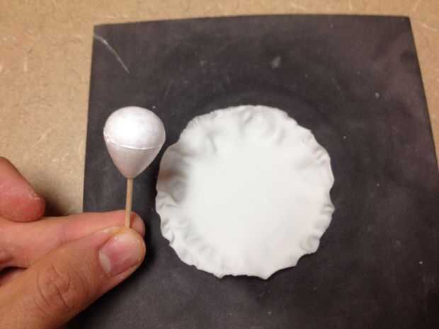 - Coloque el círculo de pastillaje sobre el cono invertido y utilizando tu pulgar y el dedo índice suavemente tire el pastillaje abajo formando el fantasma