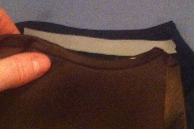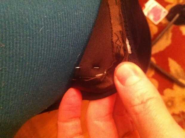 Cortó las correas del sujetador y tiras de camiseta y pin la parte superior y sujetador junto.