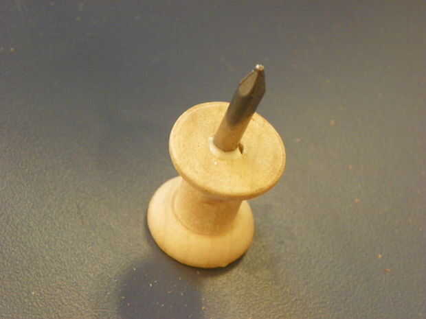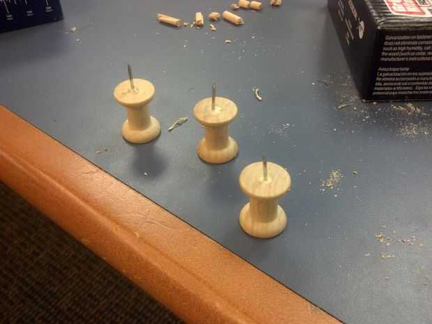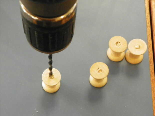 Cuando se haya secado el pegamento con los tacos en los carretes, perfore un agujero en el centro de ellos. Esto será el agujero que cada clavo es, así que utilice una broca de tamaño correcto. El seguimiento de las medidas que usaste porque los necesitarás en el paso 3.