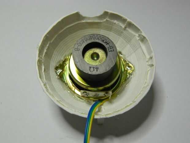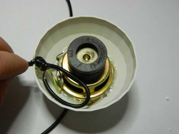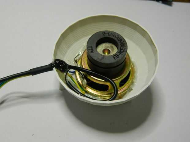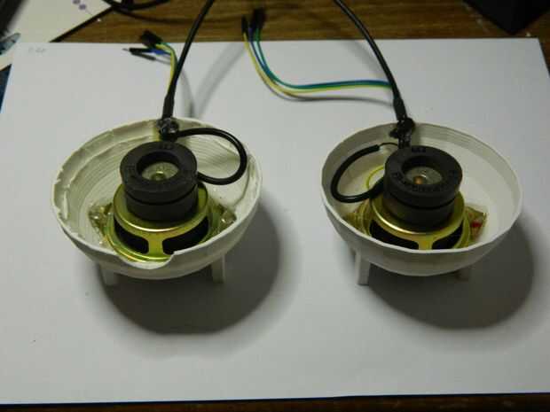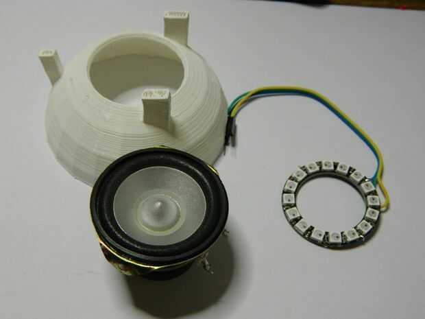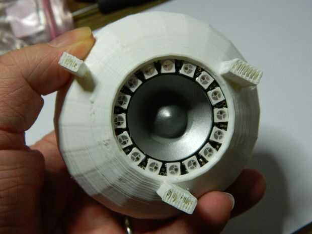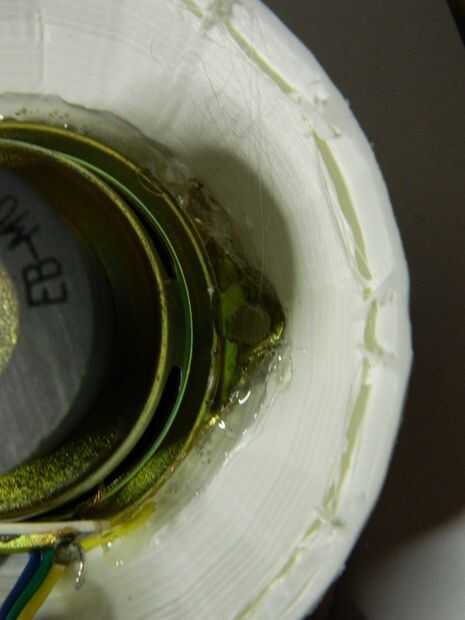 Después de despliegue los soportes de los altavoces si es necesario. Utilice pegamento caliente para fijar el altavoz en su lugar. El altavoz va en la parte superior del anillo led.