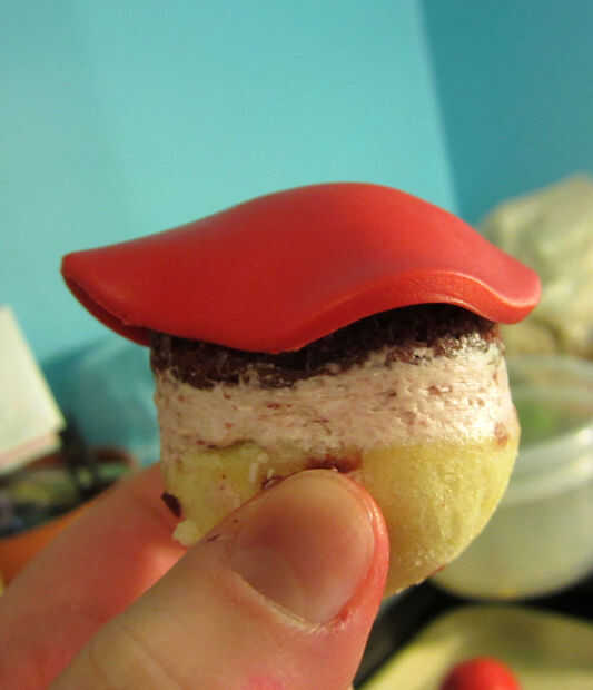 Quieres hacer primero la parte roja. Si haces primero el lado blanco, existe la posibilidad de que el lado rojo abierto podría desprender unas migajas mientras trabajaba y que se vean horriblemente en el fondant blanco. Es mejor contener primero el color pastel.