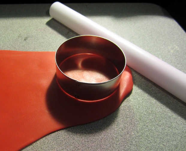 Se aplican algunos maicena a la superficie de trabajo. Extienda una capa fina de fondant. Más cómodo usted está con fondant, el diluyente puede razonablemente vas; el más reciente estás a él, cuanto más gruesa puede mantenerlo. Mis tortas había un montón de golpes y contusiones de hacer un viaje en autobús largo en un plástico del bolso, así que rodé grueso--aproximadamente 1/8". Cortar un círculo con su cortador de galletas, desea que el tamaño que apenas tímido de montaje medio alrededor de la torta.