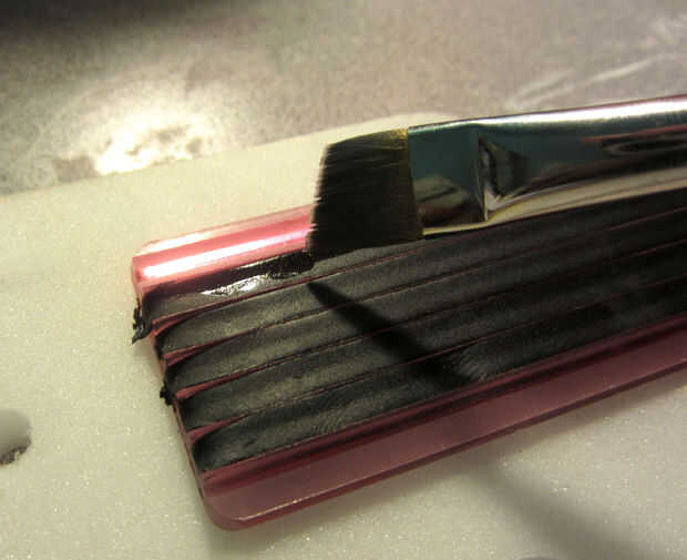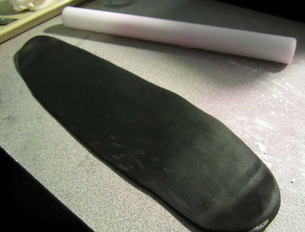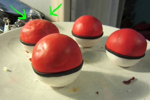 Aplicar un poquito de extracto de limón, claro alcohol o agua a la parte de atrás de la raya, luego envolver cuidadosamente alrededor de la bola. Tienes unos segundos para empuje en su lugar, pero ten en cuenta que húmedo negro fondant sobre fondant blanco dejará manchas realmente malas.