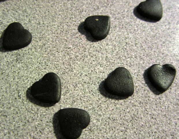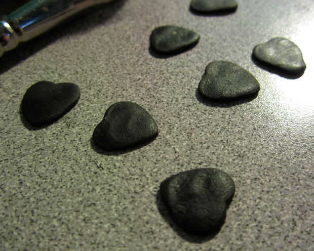 Estirar un poco muy fino de fondant negro. Perfore el corazón, hacer 1,5 X lo que usted necesita para acomodar para caer, haciendo que los feos, etc.. Aplane los ligeramente para que queden más grandes alrededor de todo el camino.