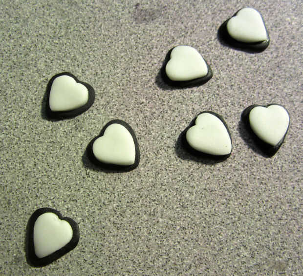Estirar un trozo de fondant blanco y perfore el mismo número de corazones. No ensuciarse éstas. Deje secar durante 10-15 minutos. Luego, usando un pequeño pincel y un extracto de agua o limón, aplique un poco en la parte posterior de los corazones blancos y pulse sobre los negros.