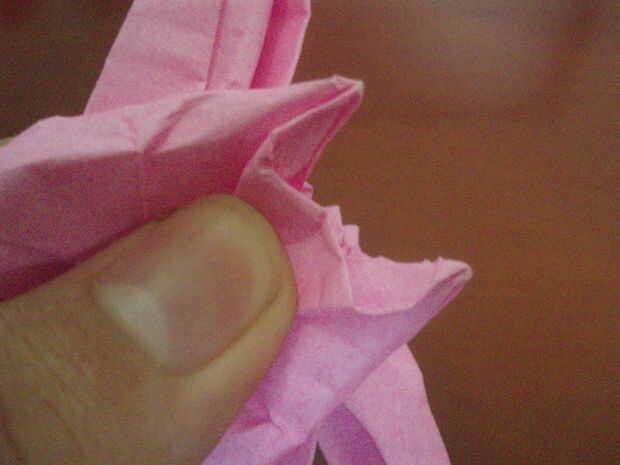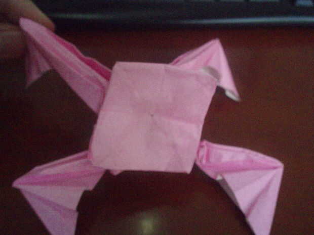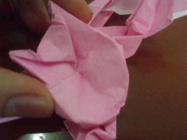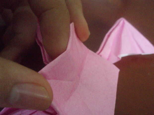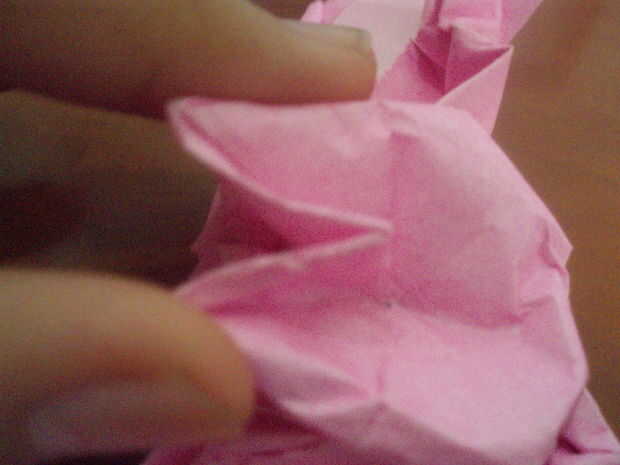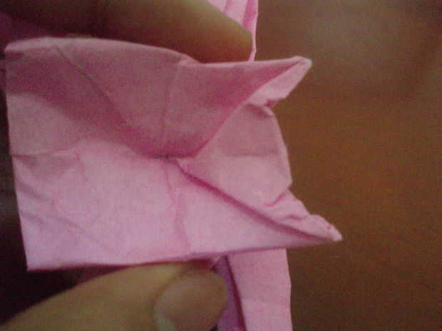 Está bien, empuje la Plaza de detrás. Agarre con el dedo pulgar y el punto. Esto formará un triángulo (ver figura). Pulse-squash-fold (este modelo no debe ser plano debe ser curva). Pliegue la punta de cada lados, esto es hacer un cuadrado pero mucho más pequeño, luego doblar las dos esquinas por lo que puede ser una forma ovalada. Y ya está!