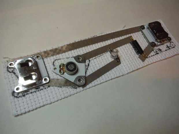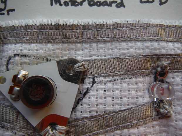 Máquina cosí la cinta en su lugar (aunque parecían bastante firmemente pegadas a la tela) con hilo normal y mano cosió los componentes con el hilo conductor. Aun cuando todo lo que tenía disponible era el "mal" tipo de hilo conductor, todavía trabajó por asegurar los extremos metálicos de las piezas contra la cinta conductora para una buena conexión.