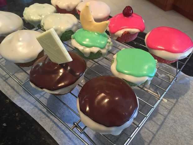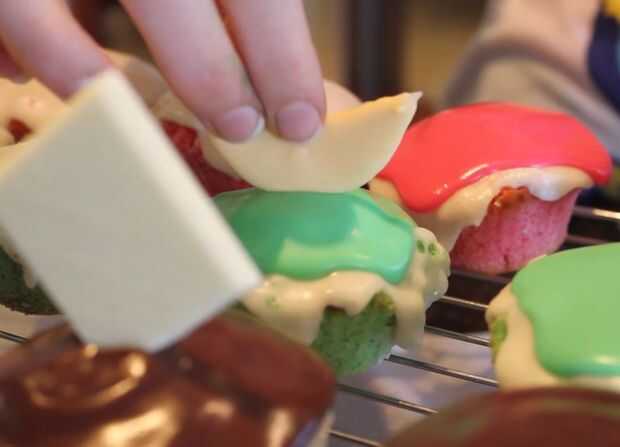 -Verde: tiene la base del glaseado blanco, guinda verde y una decoración color amarillo media luna (luna de chocolate blanco coloreado)