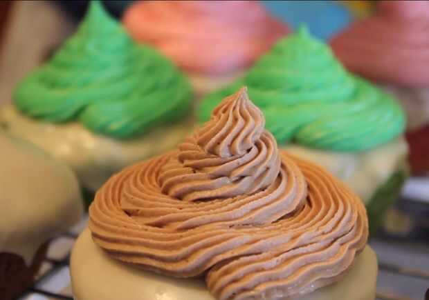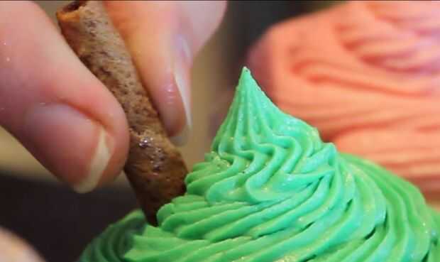 -Color de rosa, verde y marrón con el glaseado blanco y el color de la mantequilla crema glaseado con un remolino de estrella en la parte superior.