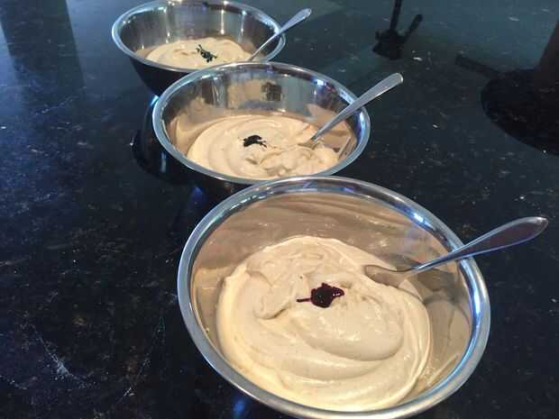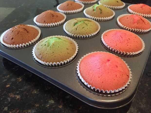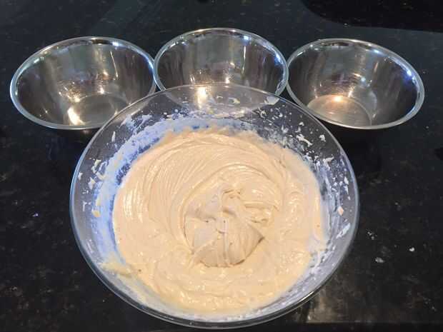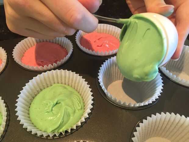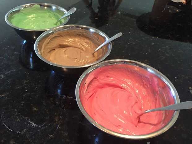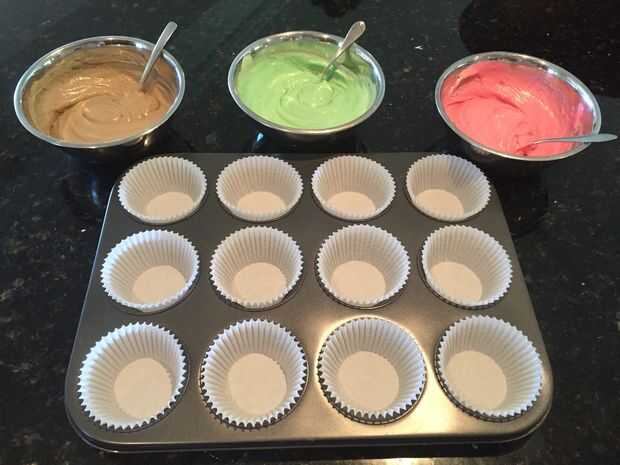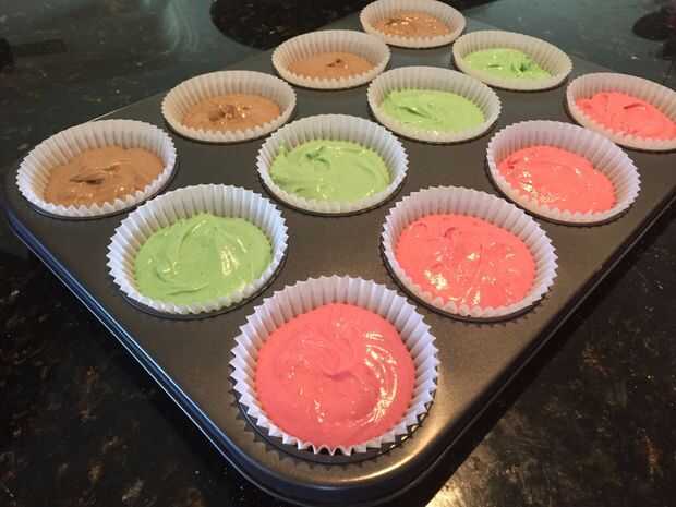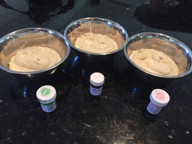 Una vez realizada la mezcla de pastel blanco igualmente separados en 3 diferentes recipientes de mezcla. En un tazón agregamos algo rosa colorante de comida, otro añadir marrón y la definitiva añaden colorante de alimentos verde. Agitar cada mezcla con cucharas separadas hasta que el color es uniforme.