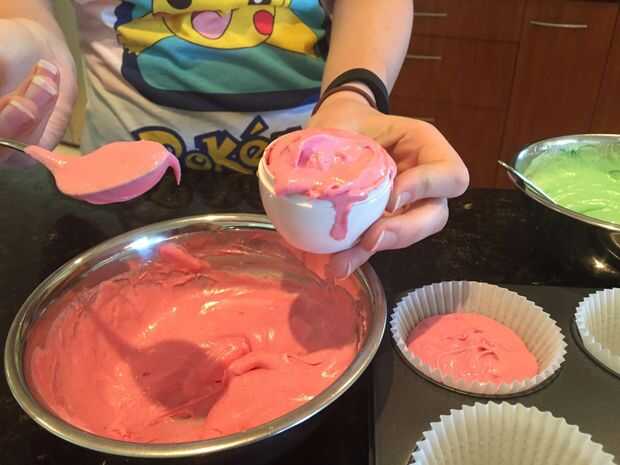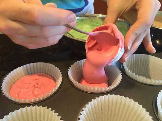 Luego Mida 1/4 taza (3 de cada color) de la mezcla de la torta y coloque en cada uno de los agujeros de lata del mollete.