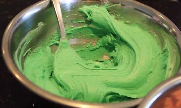 Glaseado de menta: Añadir 1/2 cucharadita de esencia de menta y unas gotas de colorante de alimentos verde y mezclar juntos. Luego con una manga pastelera con punta estrella tubo en los restantes dos cupcakes verdes.