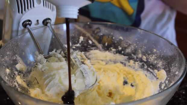 Glaseado de chocolate: Añadir 1 cucharadita de cacao en polvo a la crema de mantequilla * opcional, añadir más alimentos marrón colorante si quieres un marrón más oscuro *, mezclar y luego la pipa en los dos últimos cupcakes marrones.