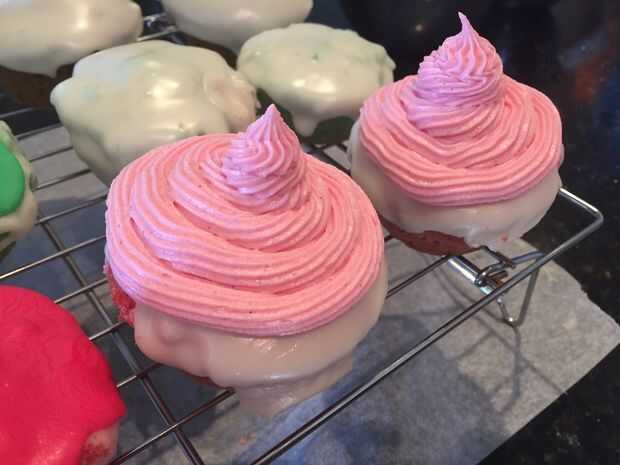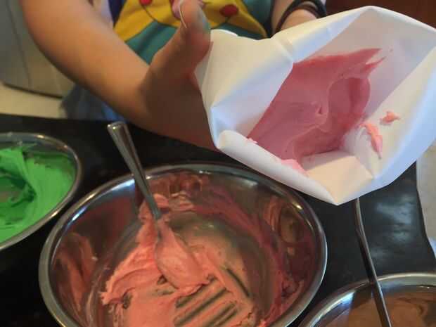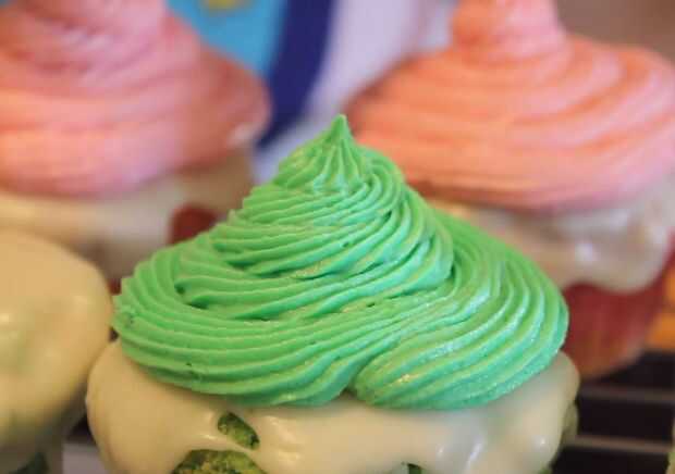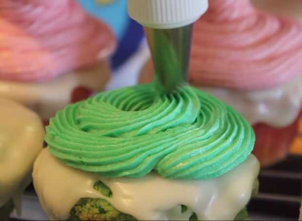 Repita con los colores de la crema de mantequilla. Ahora debe haber 2 cupcakes de helado de cada sabor (6 en total) y 2 cupcakes helados de cada sabor (6 en total).