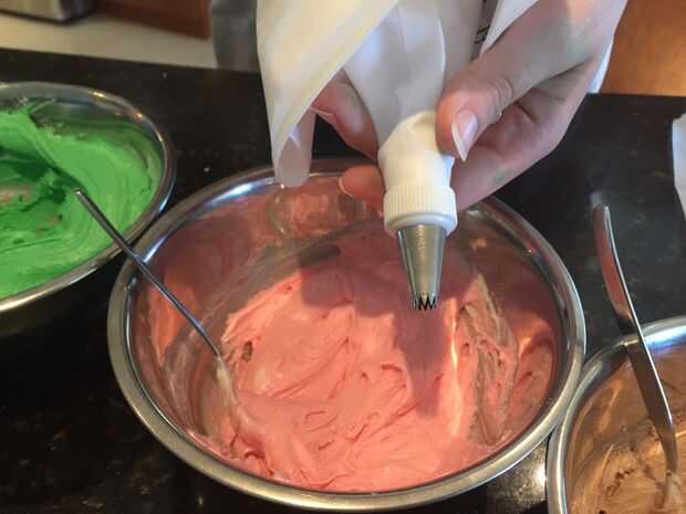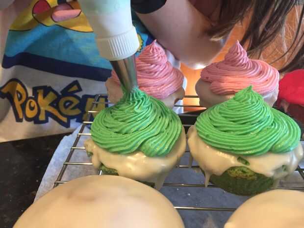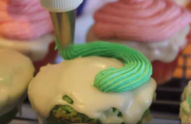 Usando en que una manga pastelera punta de estrella pone la crema de mantequilla coloreada helar pipa el glaseado en la parte superior del cupcake en un remolino circular (del exterior hacia el interior) hasta que llega a la mitad y terminar el remolino por la Manga pastelera para hacer un punto de elevación.