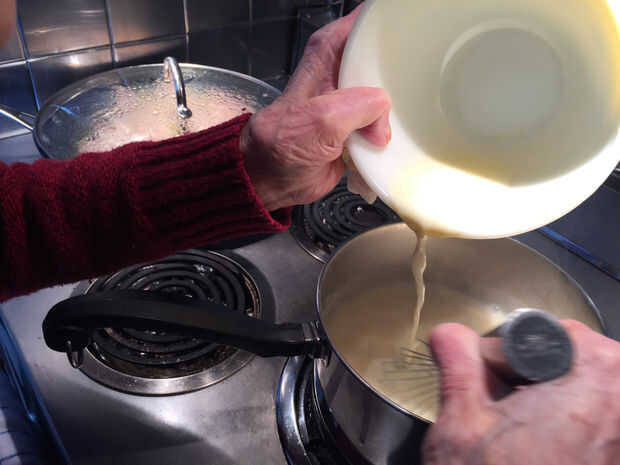 Encienda su sopa de baja y con un chorro muy fino y lento agregue la mezcla de leche teniendo cuidado de mantener su temperatura lo suficientemente baja para que no cuaje la leche. Esto es importante! Continuar a batir para que no cuaje la sopa.