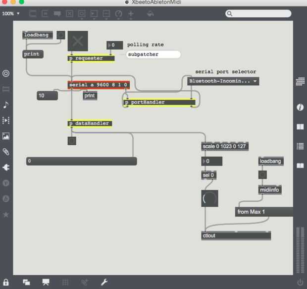 Copie el texto siguiente y luego en Max MSP y en archivo, seleccione nuevo desde portapapeles. Esto debería permitir que se abra un parche que le permite aceptar los datos en serie en y entonces escala esos datos a un valor entre 0 y 127, los datos de cc de la gama de MIDI. Asegúrese de que la velocidad en baudios en el objeto serial coincide con la tasa de baudios que está utilizando, seleccione el puerto serial correcto y luego cambiar el serial Traductor en (la gran palanca en la parte superior del parche).