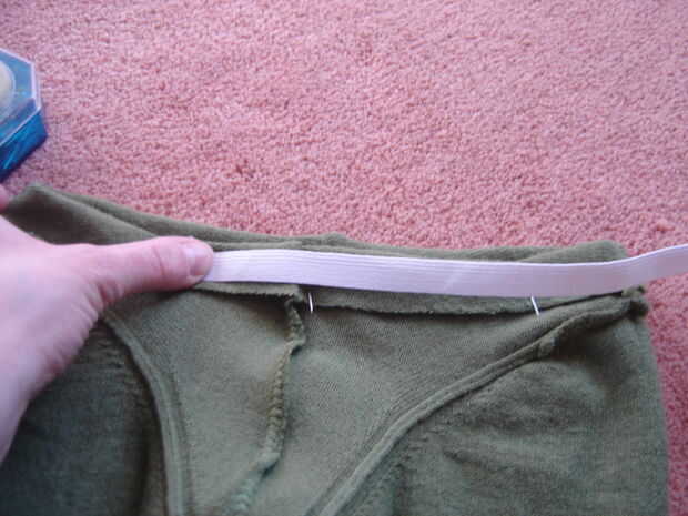 Si no utilizas "Plan B" para sus piezas, cortadas en la parte superior de los pantalones a 1" por encima de la cintura de su hijo, lo que es bastante uniforme alrededor de todo el camino.  Usando el elástico como una guía, pliegan y perno de la cubierta de la cintura en los pantalones.  Hacer la carcasa por lo menos 1/4" de más ancho que el elástico.  Hazte un favor y asegúrese de que todas las costuras se doblan en la misma dirección todo el camino alrededor de los pantalones.  Esto hará que roscar el elástico mucho más fácil.