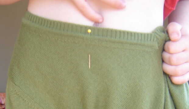 Con la pierna de su hijo en la manga del suéter de la, alinear la costura del hombro del suéter con su cadera. Luego alise suavemente el tejido del cuerpo suéter a través del abdomen de su hijo, con el escote de la chompa aproximar una pretina. Esto depende del cuello de la chompa está utilizando--mi suéter verde era un escote en v, por lo que fue muy fácil caber alrededor de la cintura de mi hijo. Un cuello de tortuga no será tan fácil, usted puede cuidadosamente Quite el collar de cuello alto para montar el suéter al niño más fácilmente. Con un alfiler, marque la ubicación del ombligo de su hijo en el frente de la Jersey. Luego cuidadosamente saque el suéter y repita con la otra pierna de su hijo (y el otro brazo de la chompa). Marca el ombligo en la segunda parte. Ahora quite el suéter y colóquela plana en el piso.