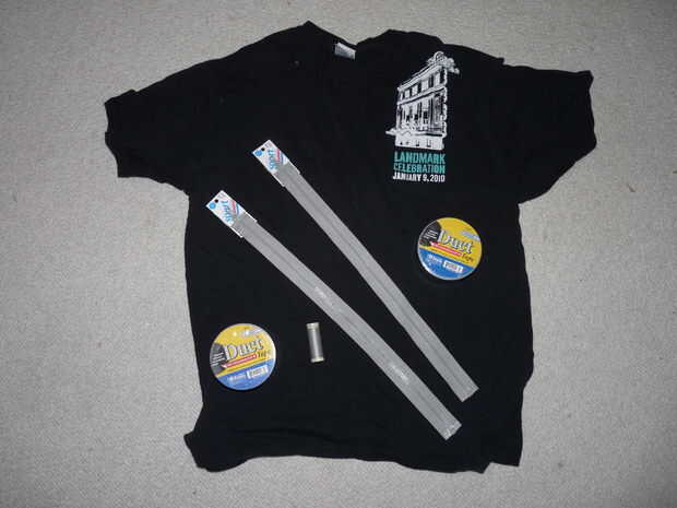 Fuentes: camiseta vieja, cinta aislante (2 rollos), 2 - 18" separación de cremalleras (peso pesado), hilo, regla, marcador, máquina de coser, aceite para máquinas de coser, Q-tips y pernos rectos.